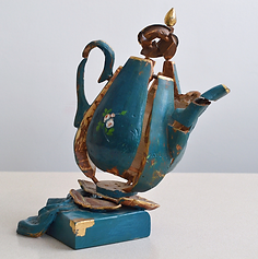 Le traumatisme de la guerre et de leur départ ont influencé son travail, telle un coup de tonnerre dans un ciel d’été. Il présente des théières, objet du quotidien “rassurant” de la douceur du cocon familial, de la maison, qu’il explose et reconstruit, telle la déflagration de sa vie.
